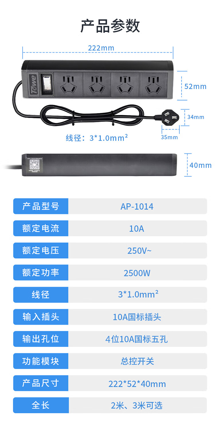 AP-1014 4位10A新国标五孔+总控开关+2米3*1.0平方线带10A国标插头