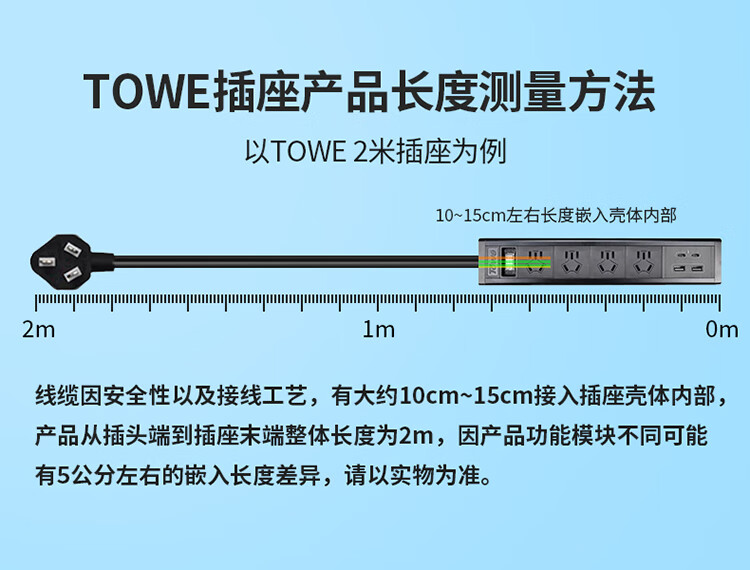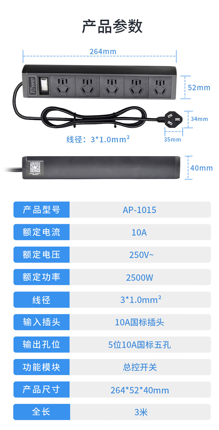 AP-1015 5位10A新国标五孔+总控开关+2米3*1.0平方线带10A国标插头