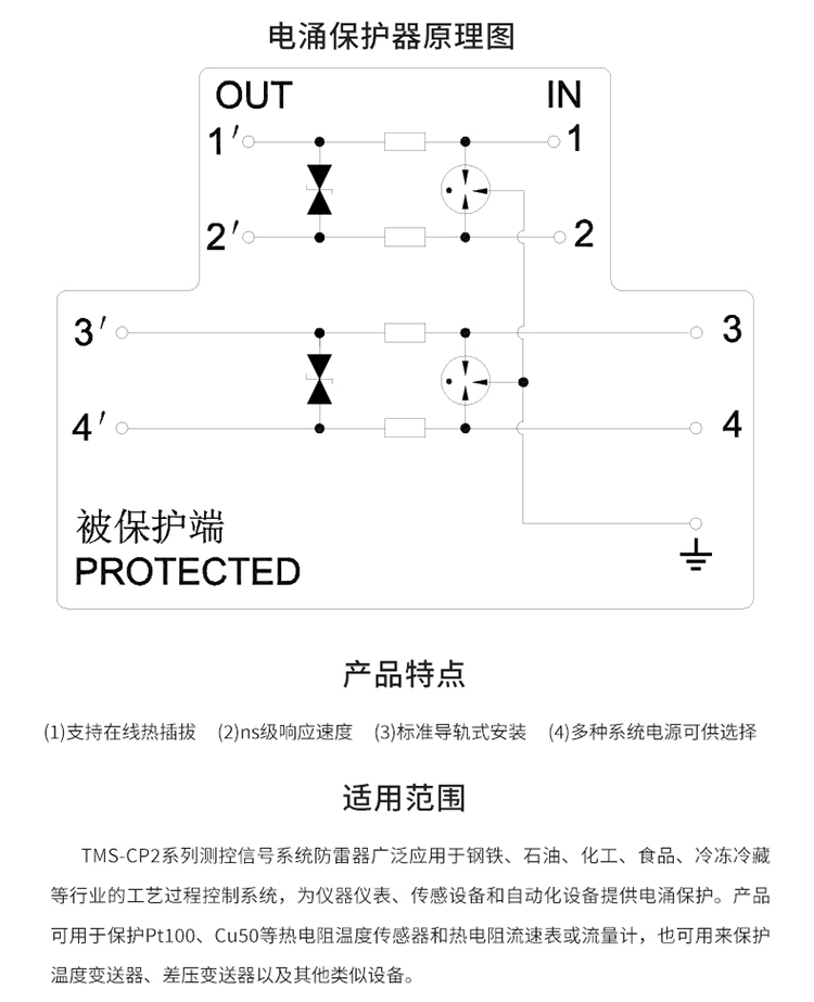 TOWE同为CP系列超薄测控信号系统电涌保护器 测控信号系统导轨安装式电涌保护器防雷器 两线本质安全电路保护 三/四线本质安全电路保护 TMS-CP2E-24DC/TMS-CP4E-24DC