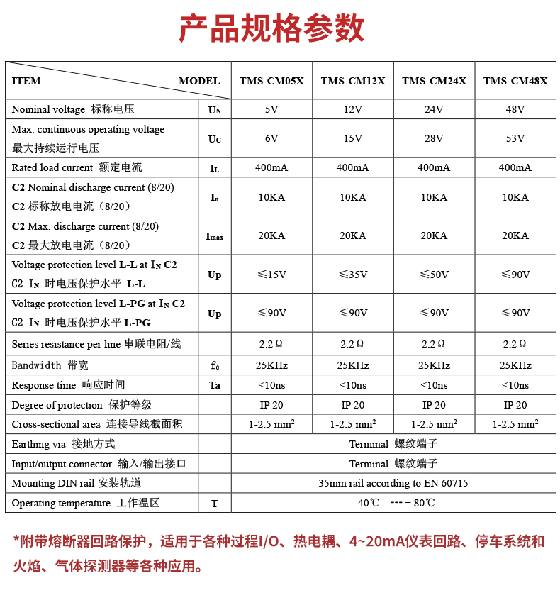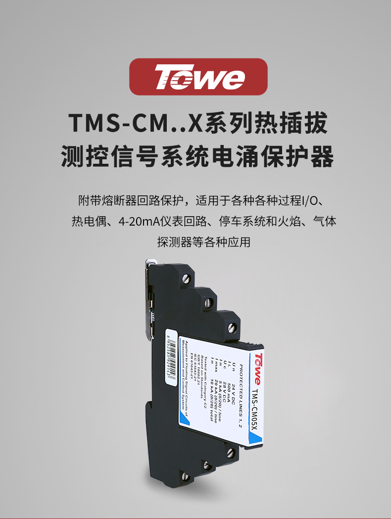 TOWE同为CM系列超薄测控信号系统电涌保护器 附带熔断器回路保护 适用于各种过程I/O热电偶4-20A仪表回路 停车系统和火焰 气体探测器等 TMS-CM05X/CM12X/CM24X/CM48X