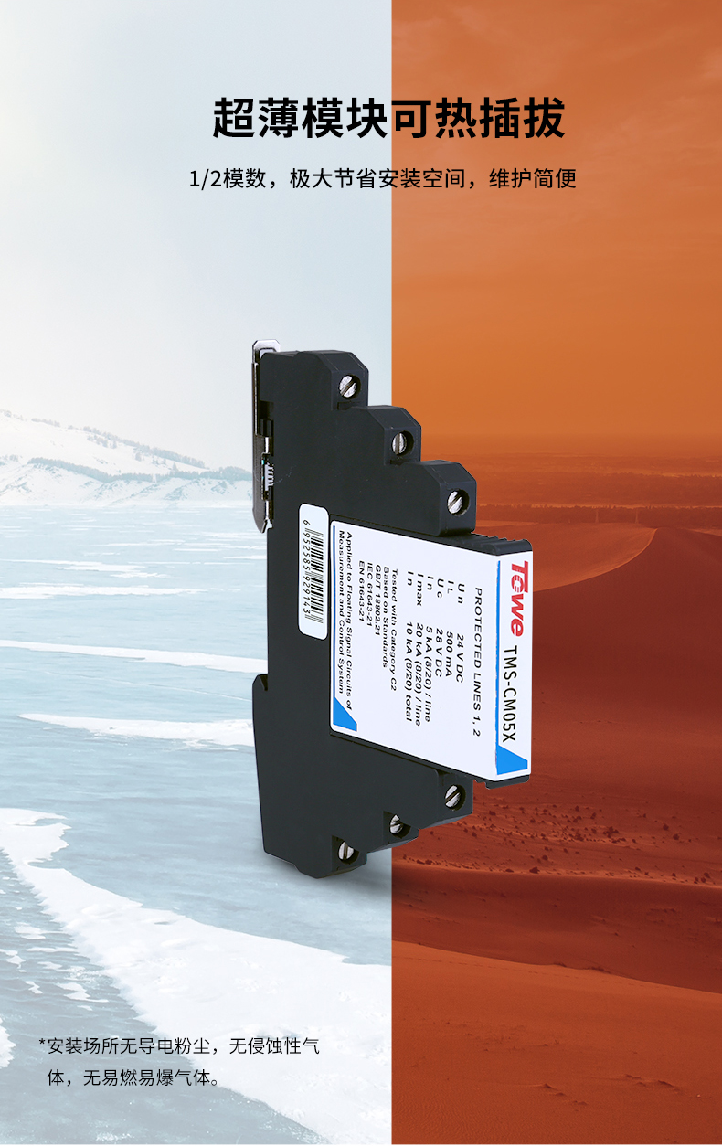 TOWE同为CM系列超薄测控信号系统电涌保护器 适用热电偶 4-20A仪表回路 停车系统和火焰 气体探测器等各种应用 TMS-CM05/TMS-CM12/TMS-CM24/TMS-CM48