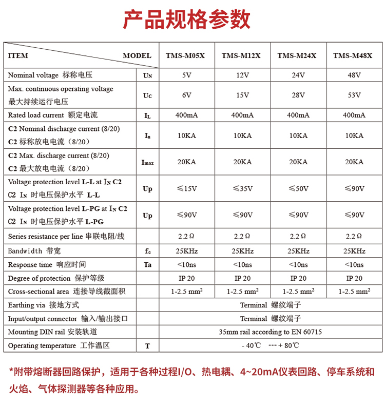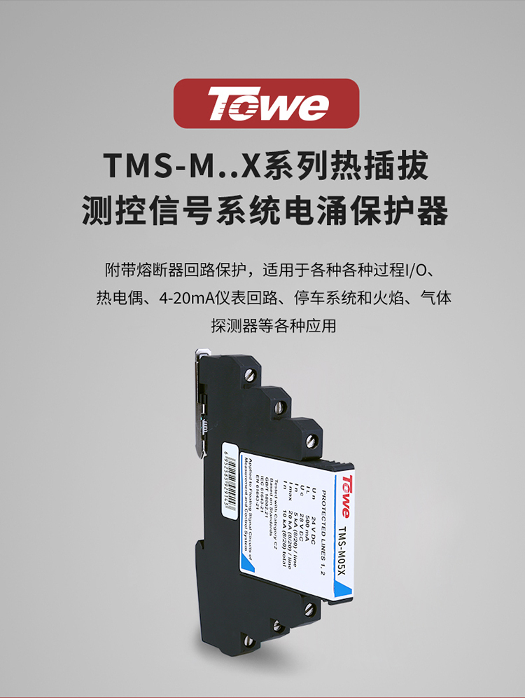 TOWE同为M系列超薄测控信号系统电涌保护器 附带熔断器回路保护 适用于各种过程I/O热电偶4-20A仪表回路 停车系统和火焰 气体探测器等 TMS-M05X/M12X/M24X/M48X