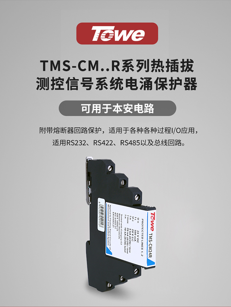 TOWE同为CM系列超薄测控信号系统电涌保护器 附带熔断器回路保护 适用于各种过程I/O 适用RS232/422/485 可用于本安电路 TMS-CM05R/TMS-CM12R/CM24R/CM48R