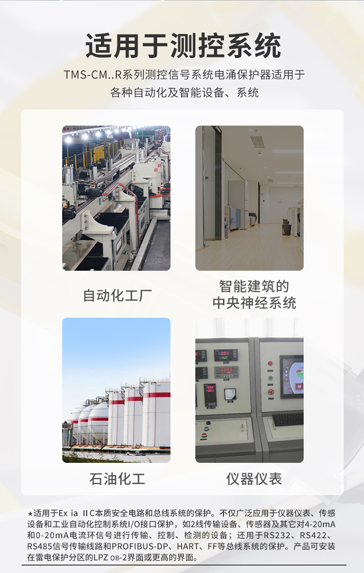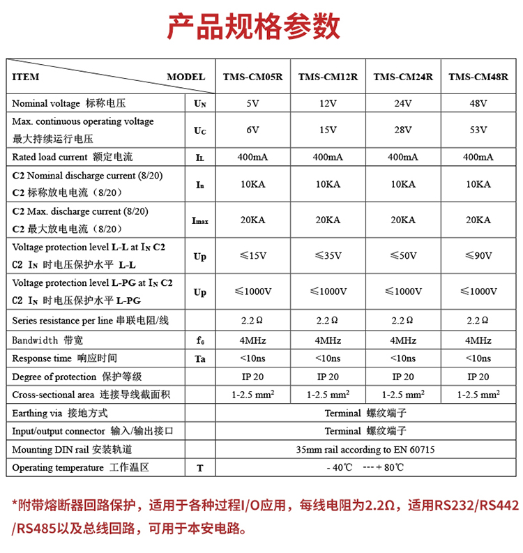 TOWE同为CM系列超薄测控信号系统电涌保护器 附带熔断器回路保护 适用于各种过程I/O热电偶4-20A仪表回路 停车系统和火焰 气体探测器等 TMS-CM05X/CM12X/CM24X/CM48X