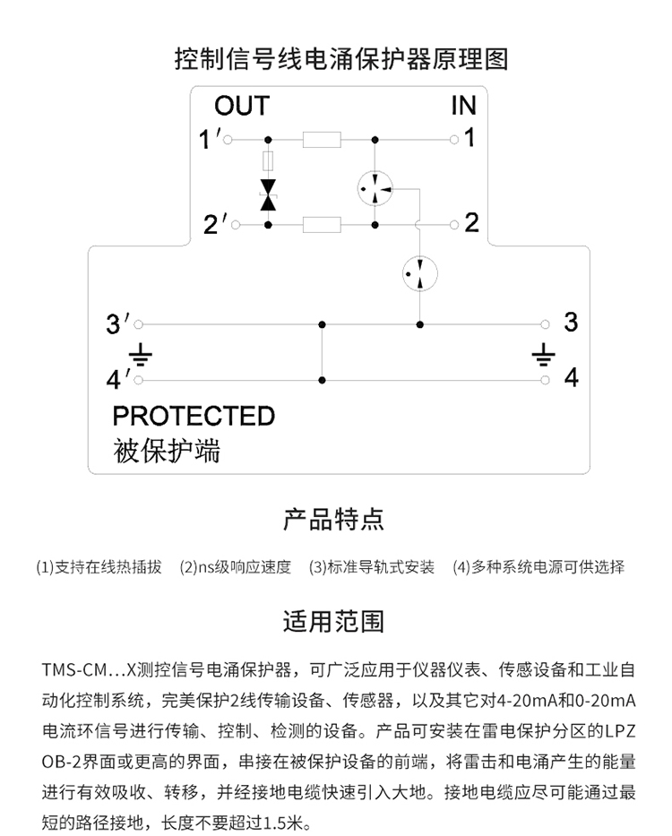 TOWE同为CM系列超薄测控信号系统电涌保护器 适用热电偶 4-20A仪表回路 停车系统和火焰 气体探测器等各种应用 TMS-CM05/TMS-CM12/TMS-CM24/TMS-CM48