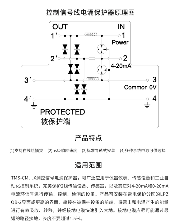 TOWE同为CM系列超薄测控信号系统电涌保护器 适用热电偶 4-20A仪表回路 停车系统和火焰 气体探测器等各种应用 TMS-CM05/TMS-CM12/TMS-CM24/TMS-CM48