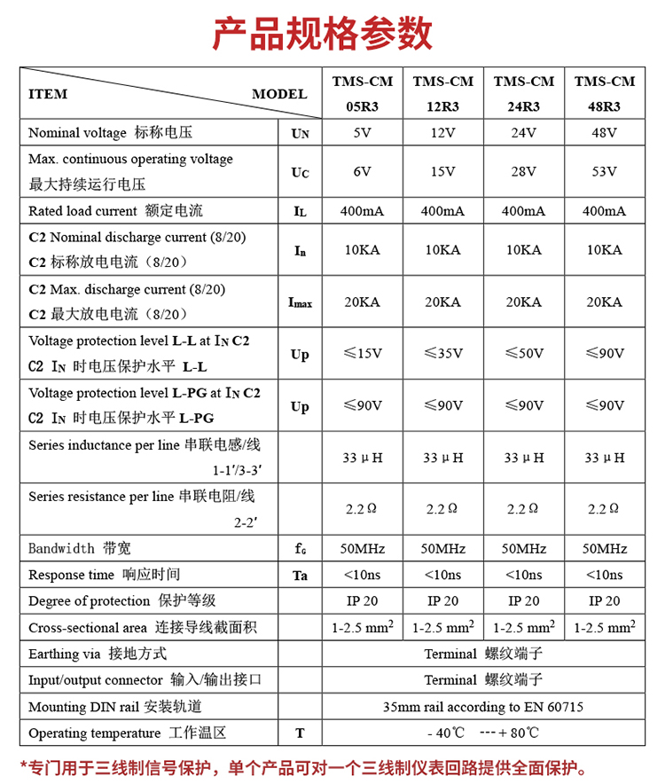 TOWE同为CM系列超薄测控信号系统电涌保护器 多级保护 适用三线信号保护 对三线控制仪表回路进行全面保护 TMS-CM05R3/TMS-CM12R3/TMS-CM24R3/TMS-CM48R3