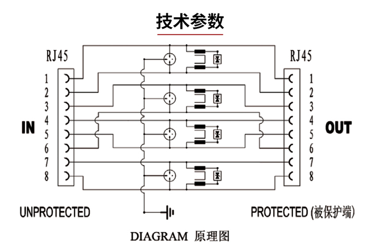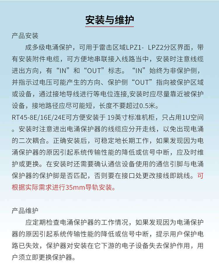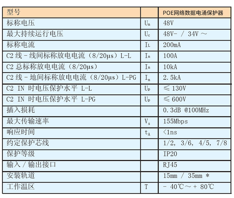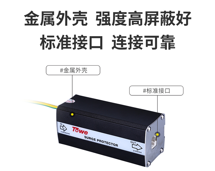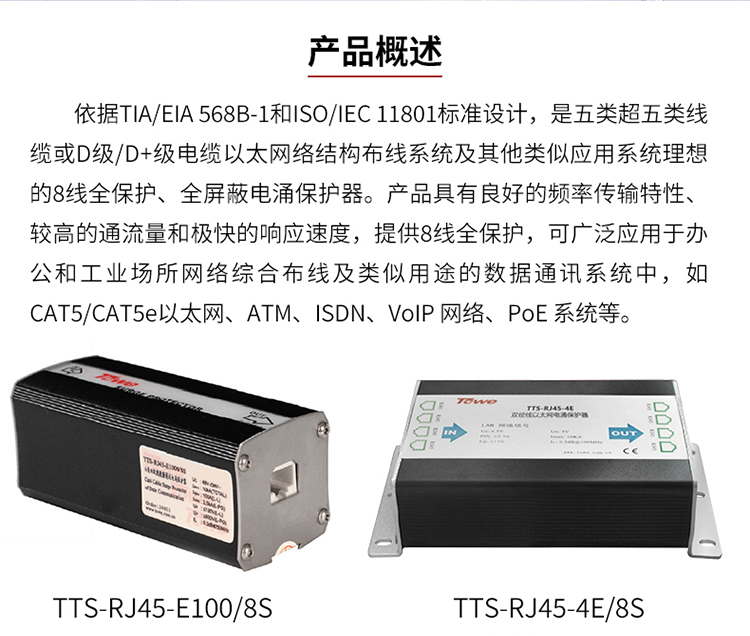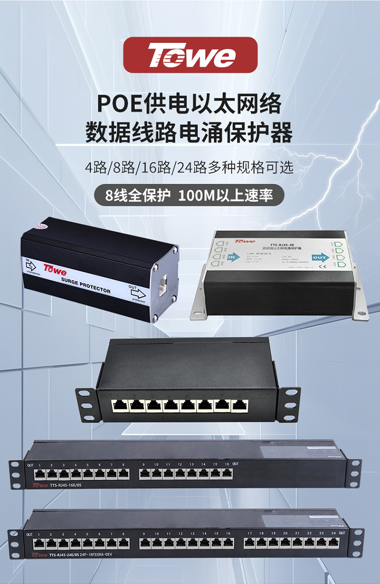 TOWE同为 RJ45 100M以太网数据通讯线路电涌保护器8线全保护单口4口支持导轨式安装,8口12口24口机架式安装POE通讯线路电涌TTS-RJ45-E100(4E/8E/16E/24E)/8S