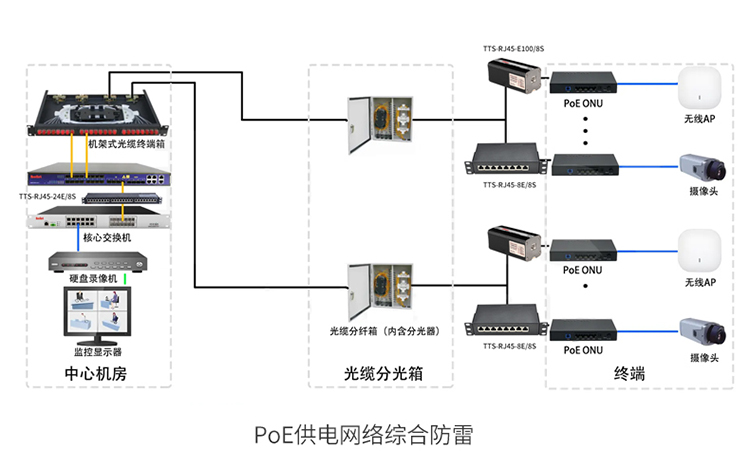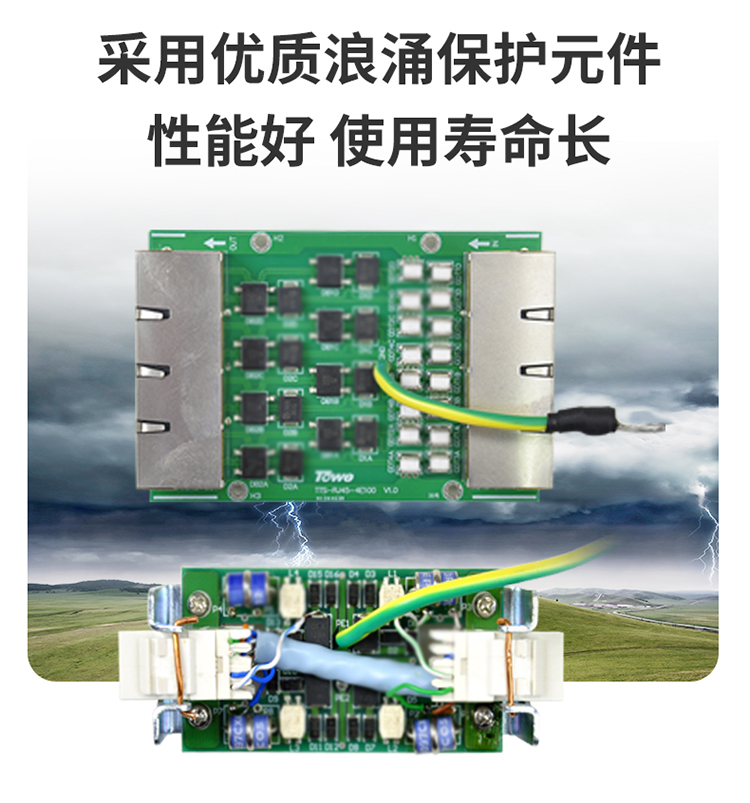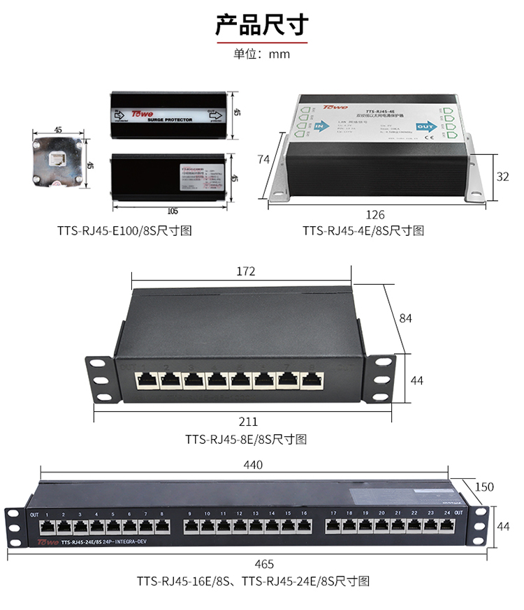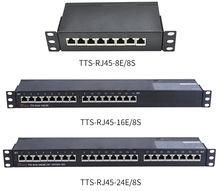 TOWE同为RJ45 100M以太网络通讯线路电涌保护器4线保护通讯网络信号避雷器单口4口可导轨式安装、8口12口24口机架式安装TTS-RJ45-E100(4E/8E/16E/24E)/4S