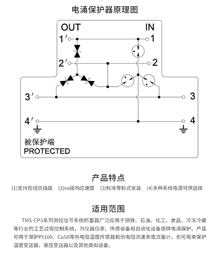 TOWE同为CP系列超薄测控信号系统电涌保护器 测控信号系统导轨安装式电涌保护器防雷器 两线本质安全电路保护 三/四线本质安全电路保护 TMS-CP2E-24DC/TMS-CP4E-24DC